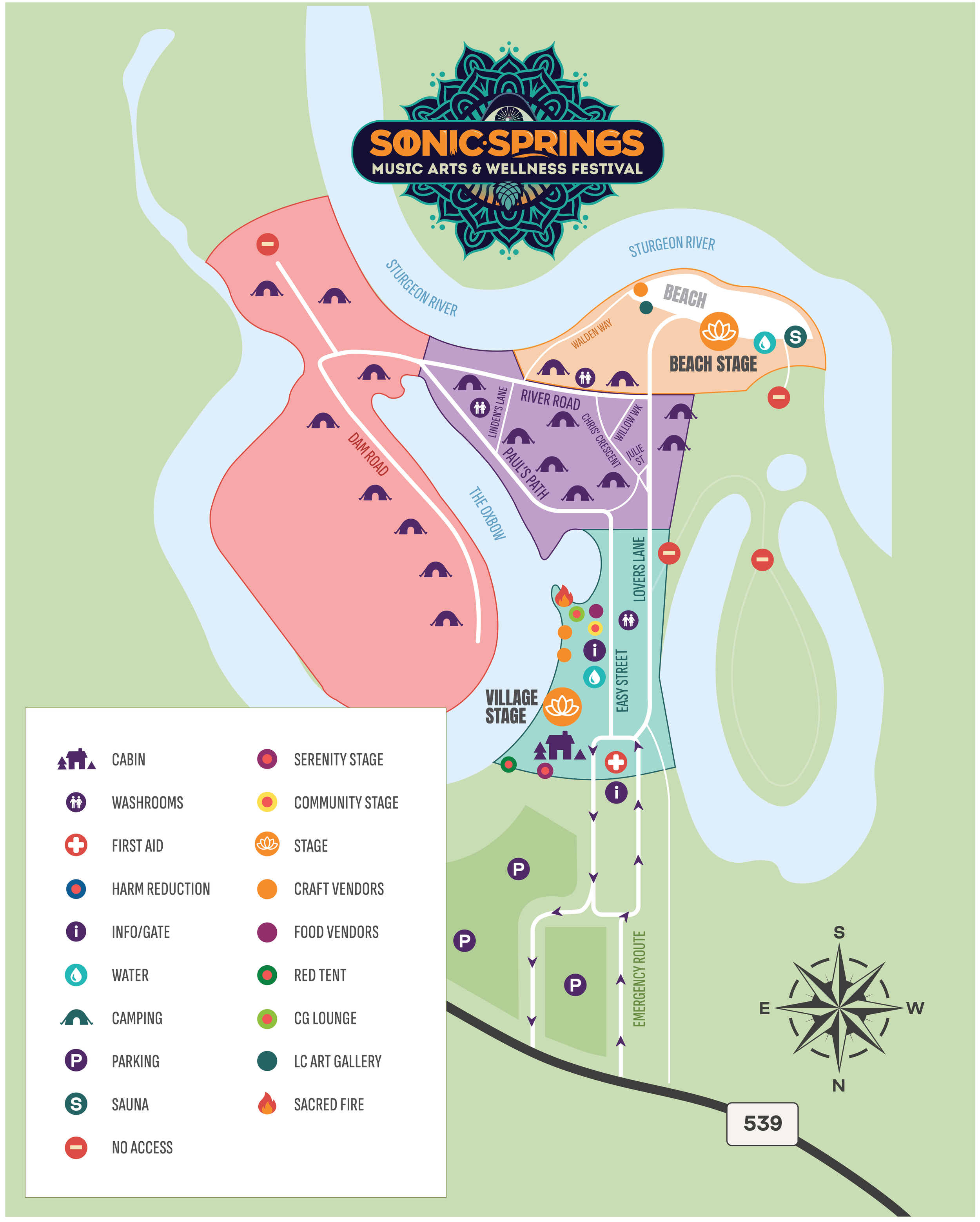 Welcome to Sonic Springs! Here's your official festival map β your guide to all the magic tucked within the forest. From stages and wellness zones to food vendors and secret paths, this will help you navigate the full experience.